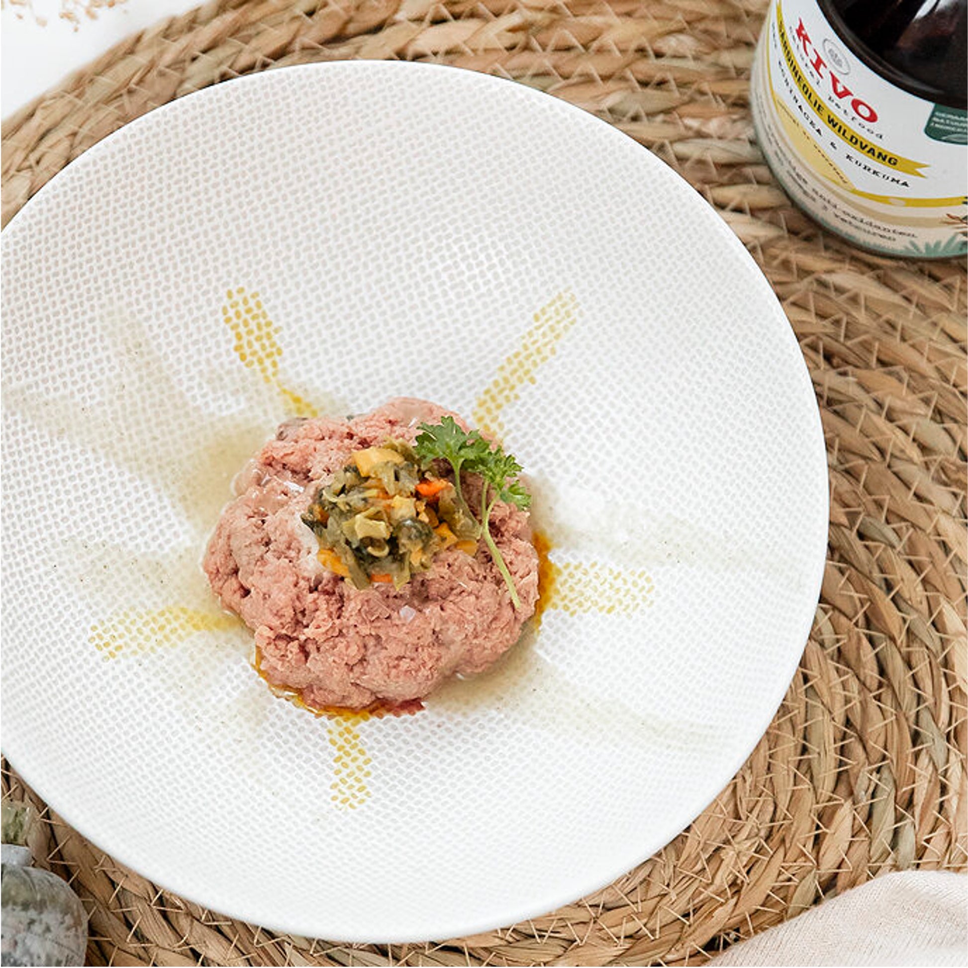 Volwassen honden: 20 tot 30 gram per kilo lichaamsgewicht per dag. Je moet ‘m wel inzetten als afwisseling, het bevat namelijk geen compleet prooidier. Een keer per week vette vis als humaan advies geldt dus ook voor je hond.