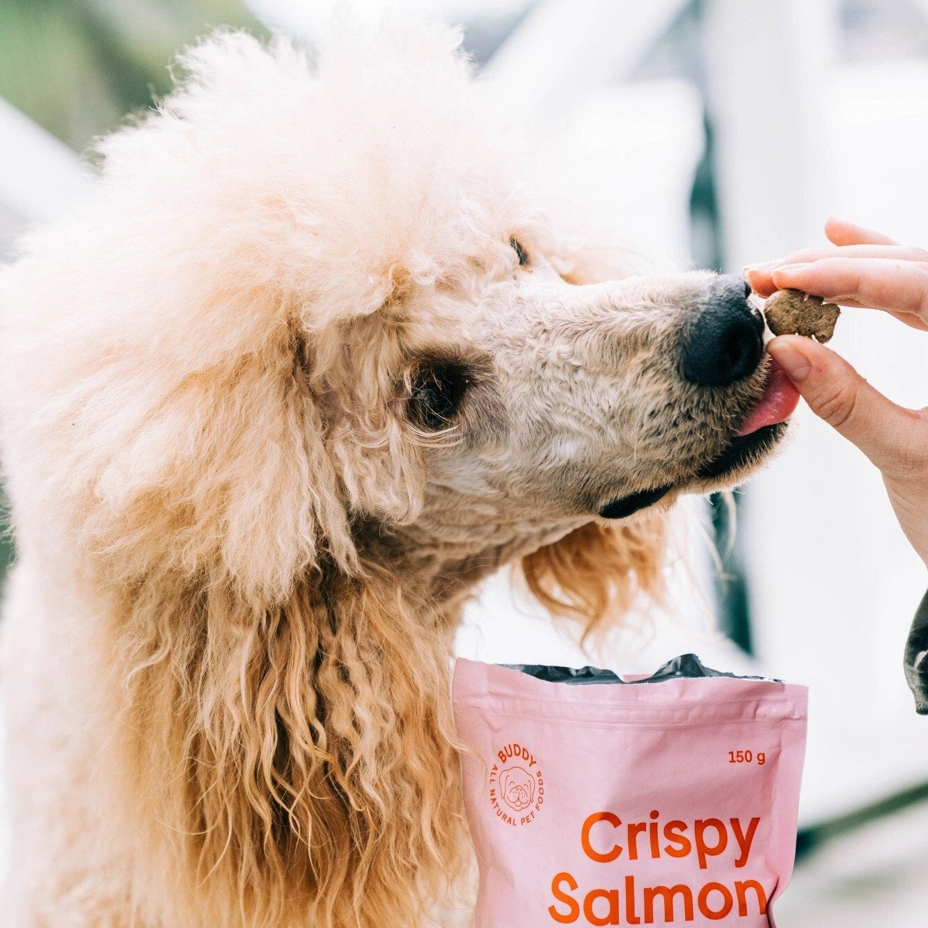 Smakelijke hondensnacks met wild gevangen zalm en blauwe bessen als hoofdingrediënten. De snoepjes hebben een fijne knapperige textuur en zitten boordevol eiwitten, vetzuren en antioxidanten die de cognitieve functies van je hond ondersteunen. Deze natuurlijke snacks zijn bereid zonder granen, gluten en kunstmatige toevoegingen.