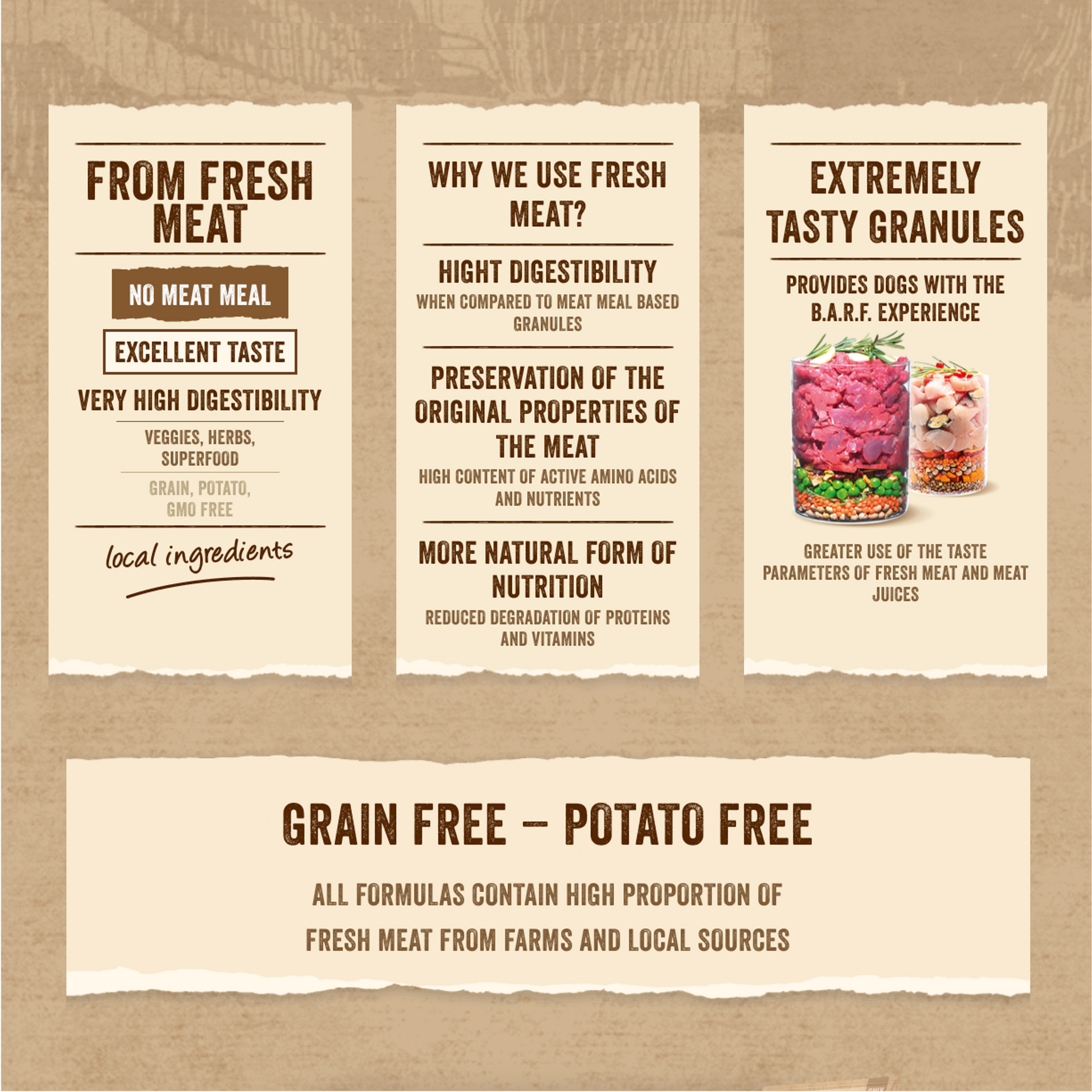 De formule heeft een hoog aandeel vers vlees van boerderijen en locale bronnen. De toegevoegde ingrediënten zoals erwten, eierschalen, rozemarijn, duindoorn, veenbessen... zitten boordevol essentiële voedingstoffen, vezels en mineralen.