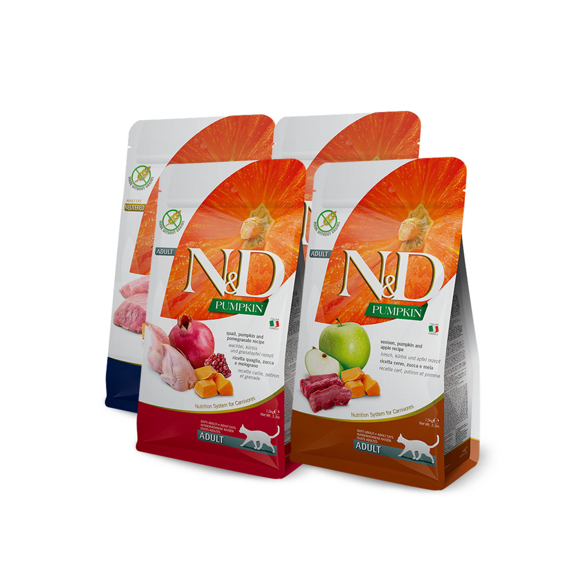 Farmina N&D Pumpkin is een 100% graanvrije droogvoerlijn die ontwikkeld is voor katten die gevoelig zijn voor bepaalde eiwitbronnen of die baat hebben bij een stabielere spijsvertering. De recepten bestaan uit 96% dierlijke eiwitten, gecombineerd met pompoen: een natuurlijke bron van vezels, antioxidanten, vitamine C & E, calcium en ijzer.