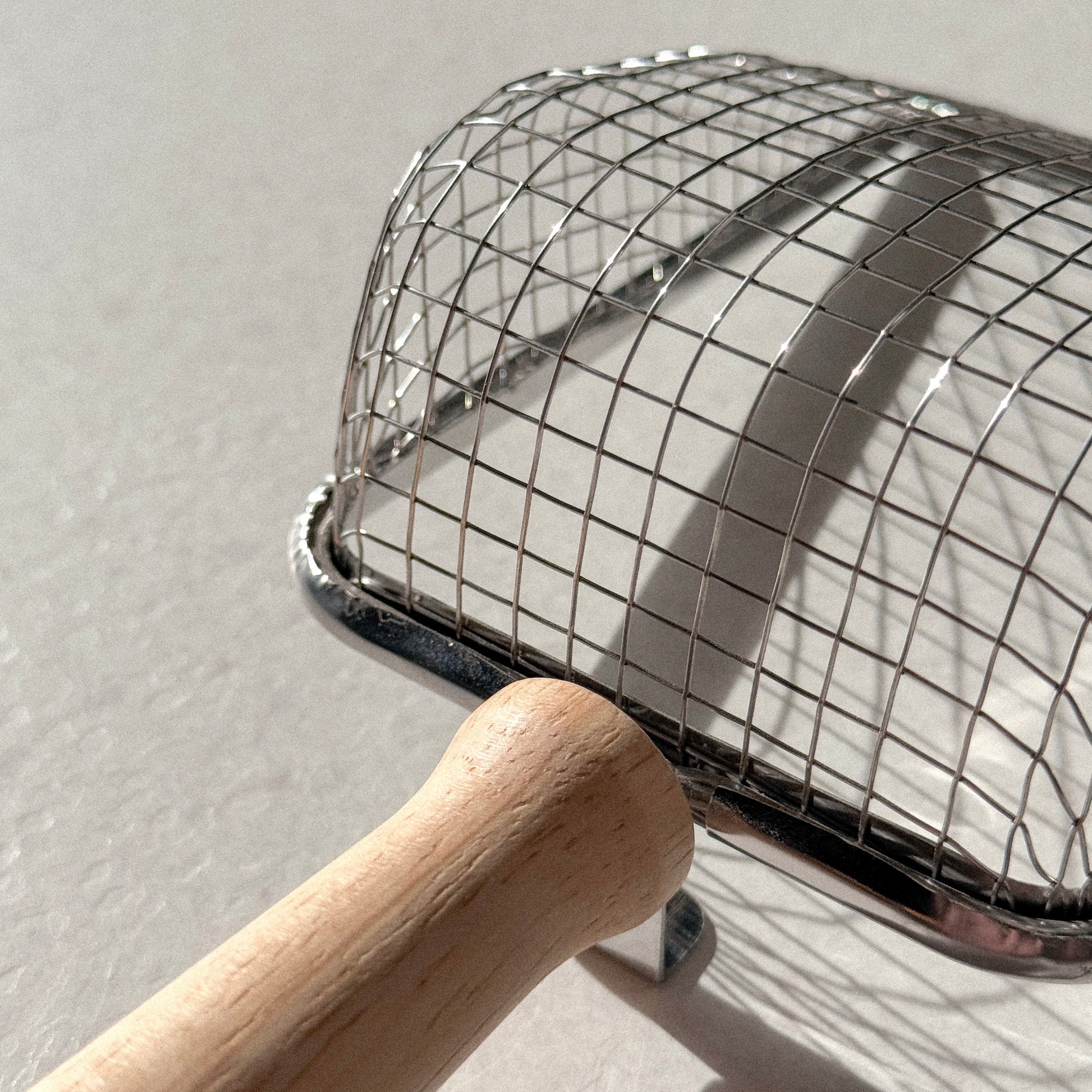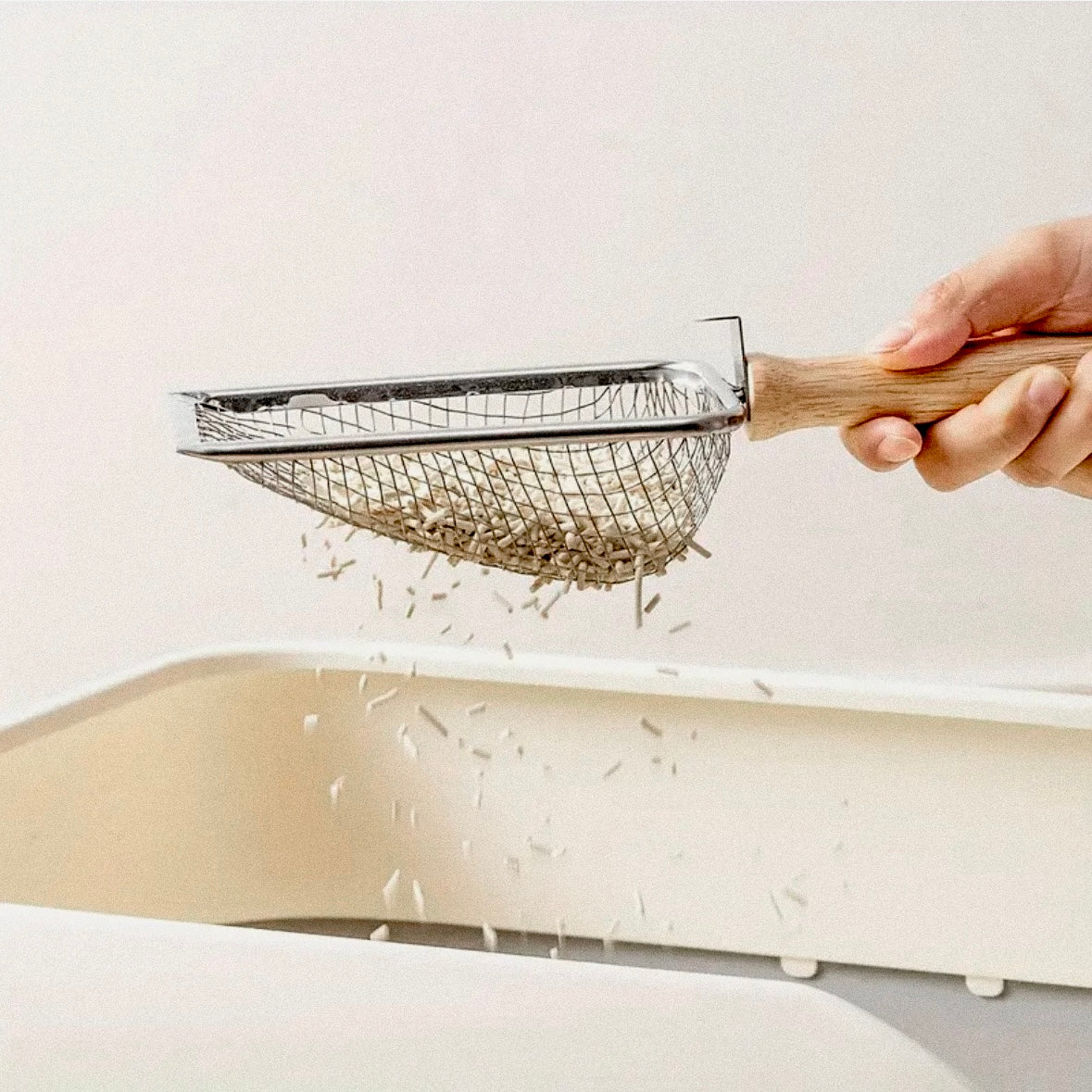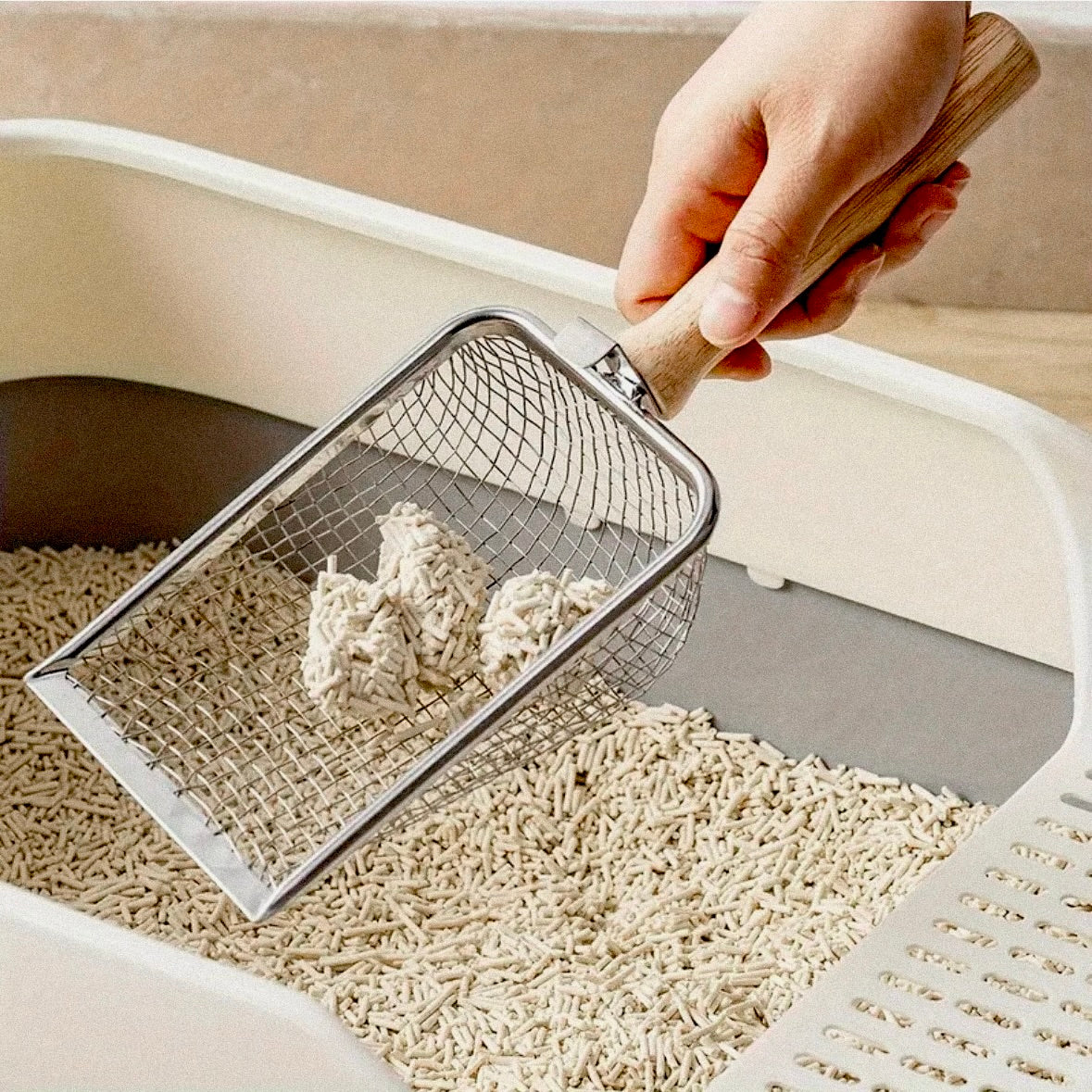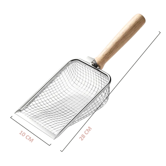 Met een comfortabel houten handvat en een handig ophangsysteem om over de rand van de kattenbak of aan een haakje op te hangen.