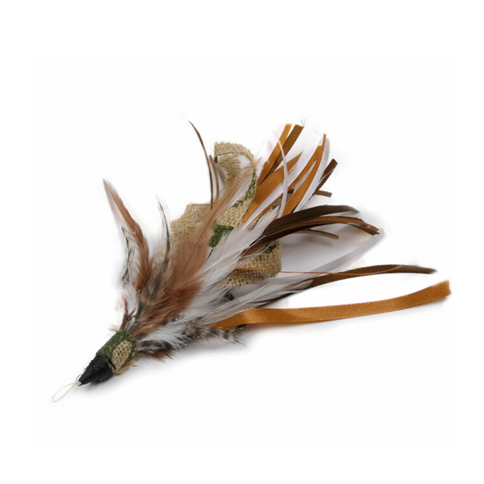 Als je huistijger gek is op lintjes, dan is dit voortaan het favoriete speeltje in huis! Maar liefst een handvol satijnen lintjes in combinatie met jute en hanenveertjes is dit een regelrechte hit! Dit speeltje is 20cm lang en kan aan een hengel gehangen worden.