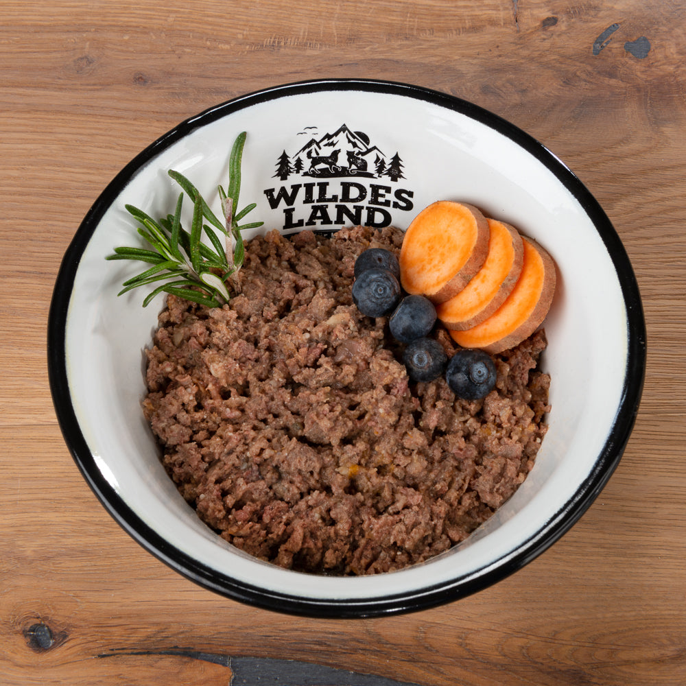 SAMENSTELLING: Rundvlees 62% (hart, vlees, lever, long, pens), bouillon 27,5%, zoete aardappelen 4%, appels 3%, bosbessen 2%, mineralen 1%, saffloerolie 0,3%, yucca-extract 0,1%, wilde kruiden 0,1% (basilicum, kamille, paardenbloem, peterselie, rozemarijn). ANALYTISCHE BESTANDDELEN: Ruw eiwit 10,8%, ruw vet 6,6%, ruwe celstof 0,5%, ruwe as 2,4%, vocht 75%. VOEDINGSSTOFFEN PER 1 KG: Vitamine D3 200 IE, zink (zinksulfaat, monohydraat) 25 mg, mangaan (mangaan(II)sulfaat, monohydraat) 1,4 mg, jodium (calciumjodaat, watervrij) 0,75 mg.